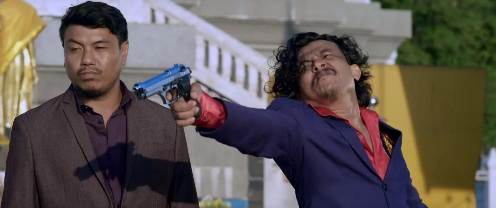 The Helmi Yusof comedy, Bikers Kental 2 opens in an engaging fashion. An intense Pornthaliwat (Bront Palarae) walks out of a Thai prison with a limp. He gets into a light scuffle with the armed guard on duty. He asks for a cigarette. His good friend awaits his arrival. They embrace as brothers would, only to be rudely interrupted by gangbangers who kidnap them. The next scene is a negotiation of sorts, one that goes wrong. The rival ganglord shoots Pornthaliwat in the chest — pow pow! He dies… and this movie along with him.